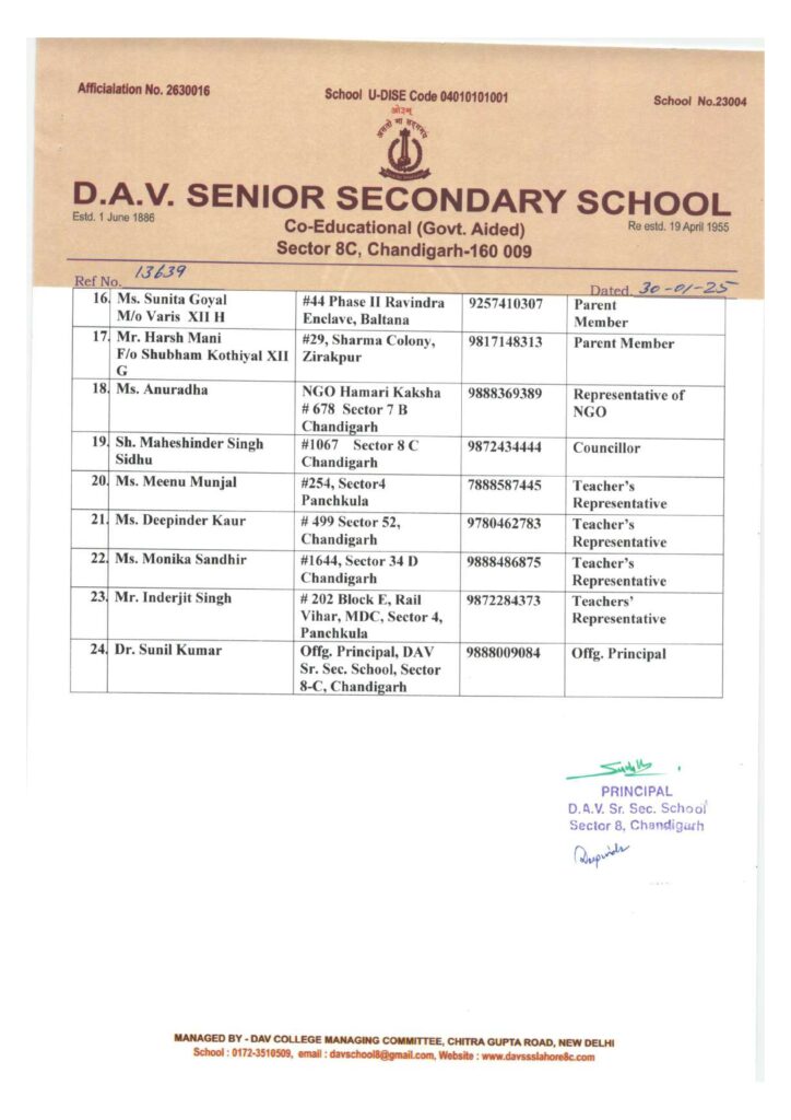 D.A.V. Senior Secondary School (Lahore) Co-Educational (Govt. Aided) Sector 8C, Chandigarh 160009